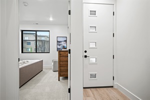 Primary Bedroom on the main floor: Features a king-size bed, plush linens, smart TV, dresser, closet, and ensuite bath with modern finishes.