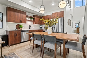 The adjacent chef-inspired kitchen is equipped with stainless steel appliances, a gas range, and ample counter space. A warm wood dining table comfortably seats six, creating the ideal space for gathering and entertaining.