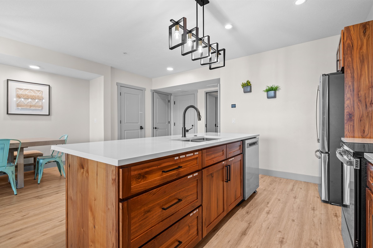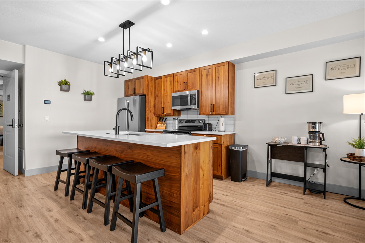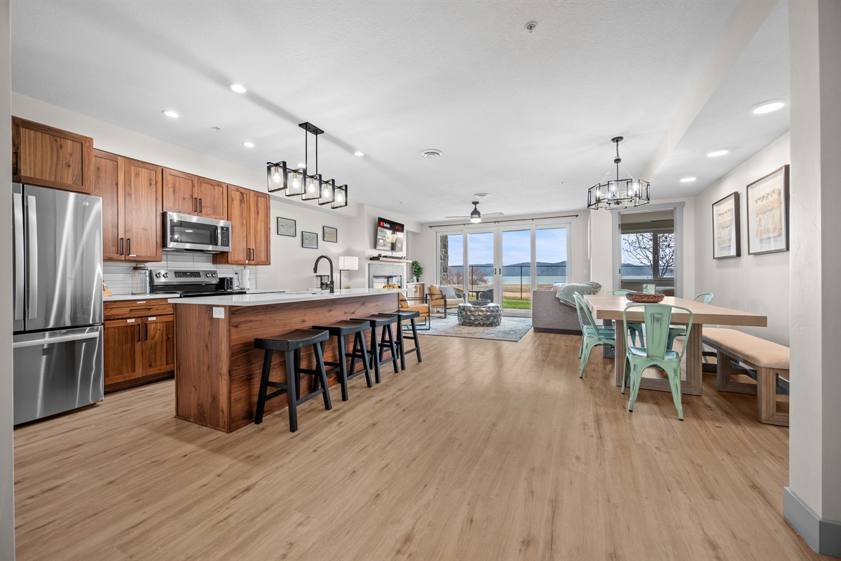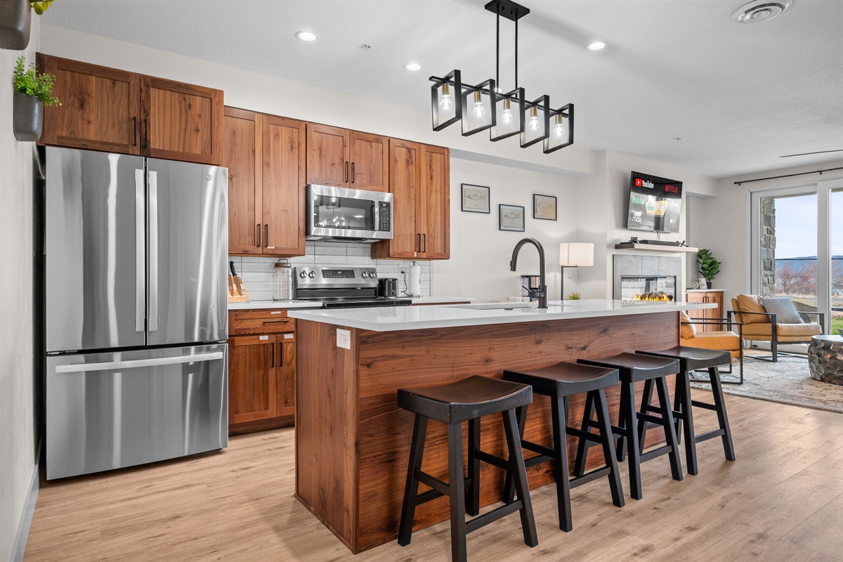 The fully equipped chef’s kitchen features high-end stainless appliances, generous counter space, and everything needed to prepare memorable group meals.
