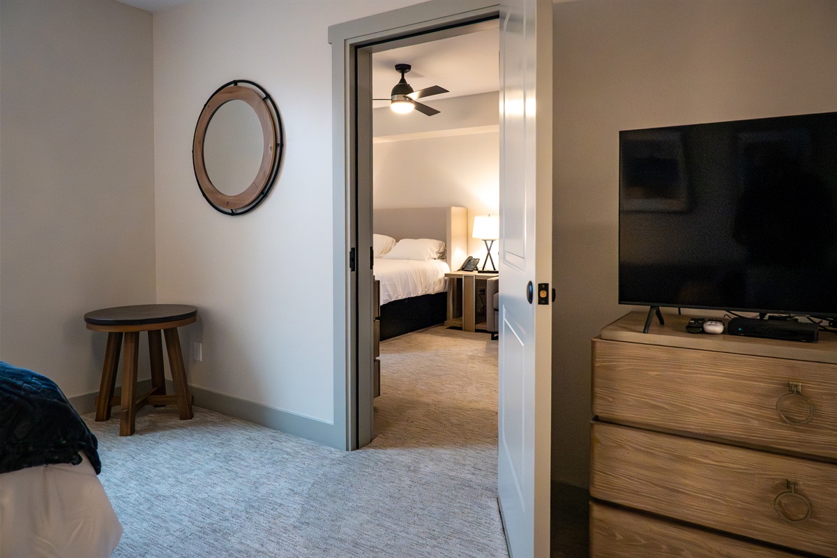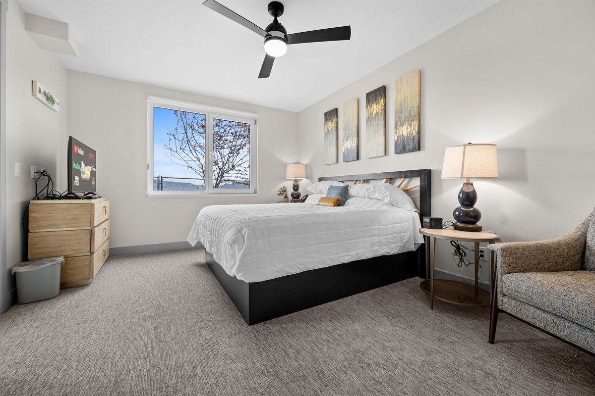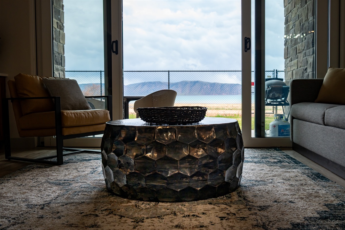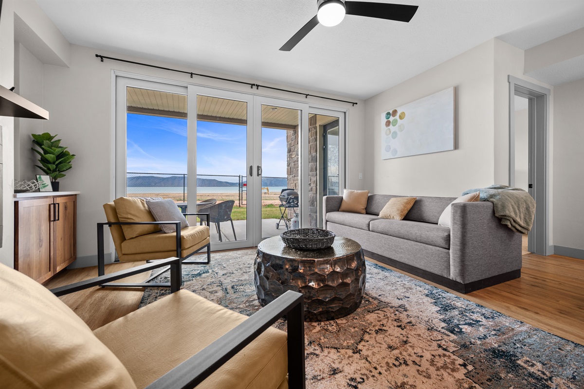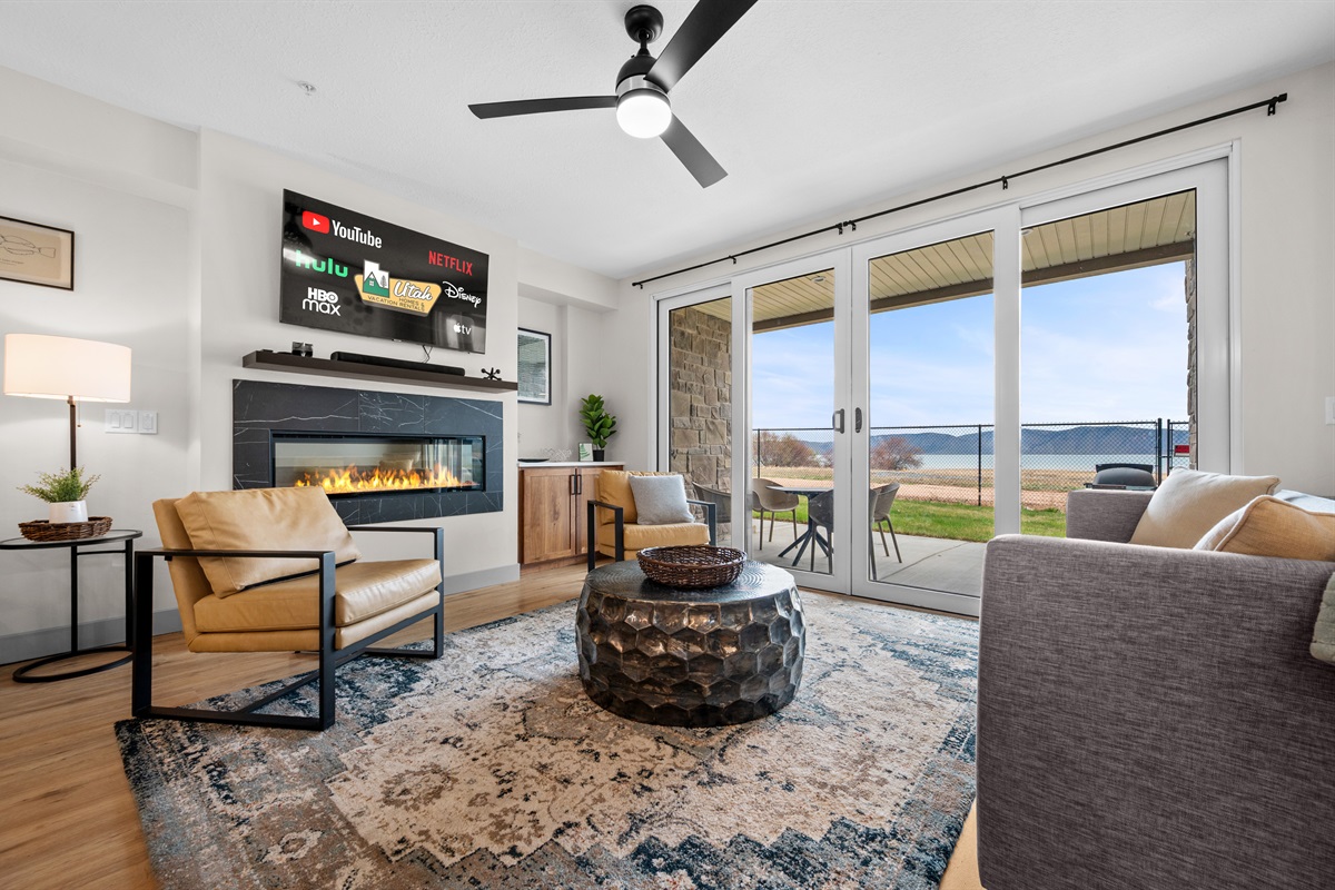 Two expansive living areas — each featuring a cozy fireplace and 65" Smart TV — provide room for everyone to relax. Large picture windows flood the home with natural light while framing breathtaking mountain and lake views.