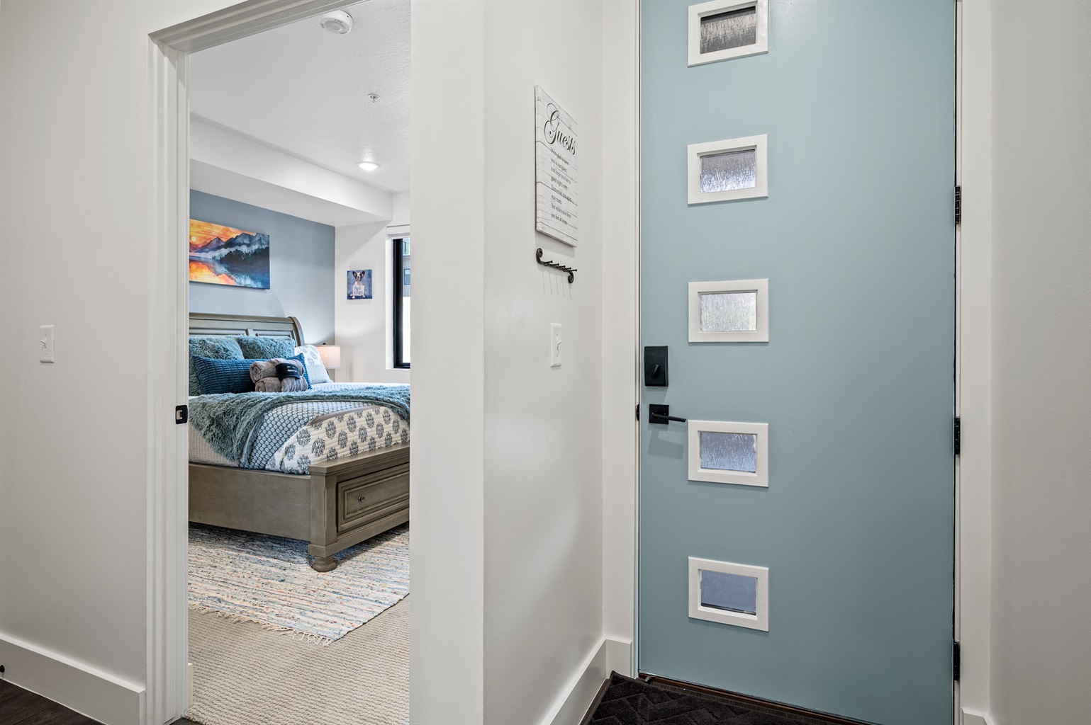 Our home features a serene bedroom with a king-size bed, a closet, a dresser, and convenient nightstand lamps with USB ports that turn on with a simple tap. An additional queen-size sofa bed in the living room provides extra sleeping space, with sheets and a quilt in the drawers beneath the bed.