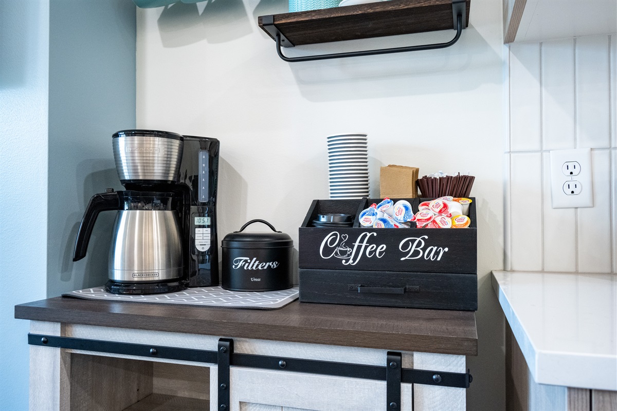 The living area offers a warm ambiance with an electric fireplace and a large Roku TV, perfect for cozy evenings. The well-equipped kitchen has everything you need, from a dedicated coffee station to a refrigerator with an ice maker and essential appliances like a microwave and toaster. Cooking is a delight with the fully stocked kitchen, including pots, pans, a griddle, blender, crockpot, bakeware, and dinnerware for up to six guests. Enjoy meals at the dining table, which seats four but can be extended to accommodate six, with a bench conveniently located in front of the fireplace.