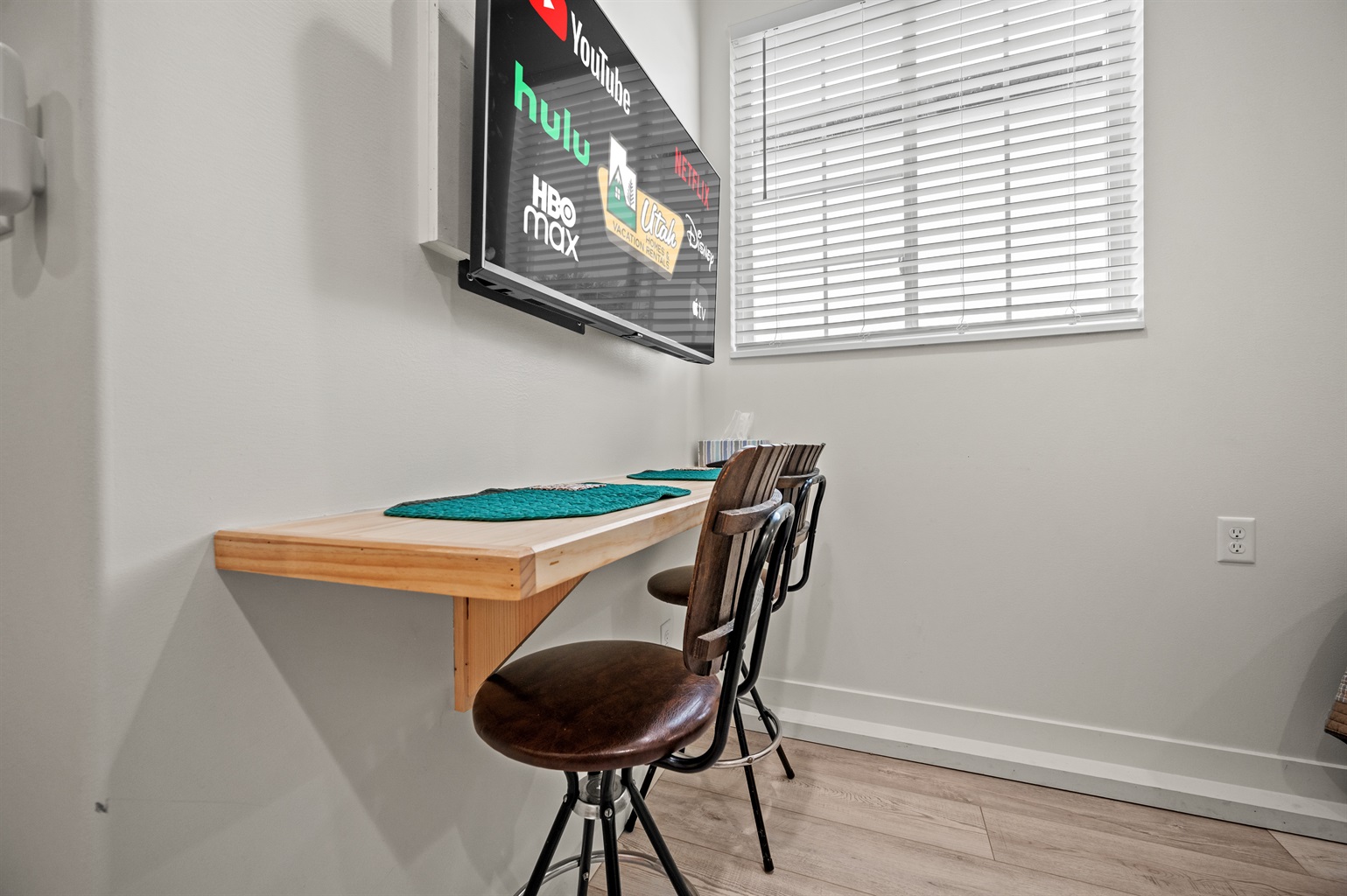 Inside, every detail is designed for comfort and convenience. Enjoy multiple kitchens and dining areas, Smart TVs, fireplaces, free Wi-Fi, and private balconies overlooking the mountains. A luxurious hot tub provides year-round relaxation, while the warm, lodge-style décor creates a cozy retreat after a day of adventure. The home also features a two-car garage, laundry room, and an expansive living area with a fireplace, large Smart TV, and board games—ideal for relaxing evenings. For those working remotely, a private office with a desk and chair offers a quiet, productive space.