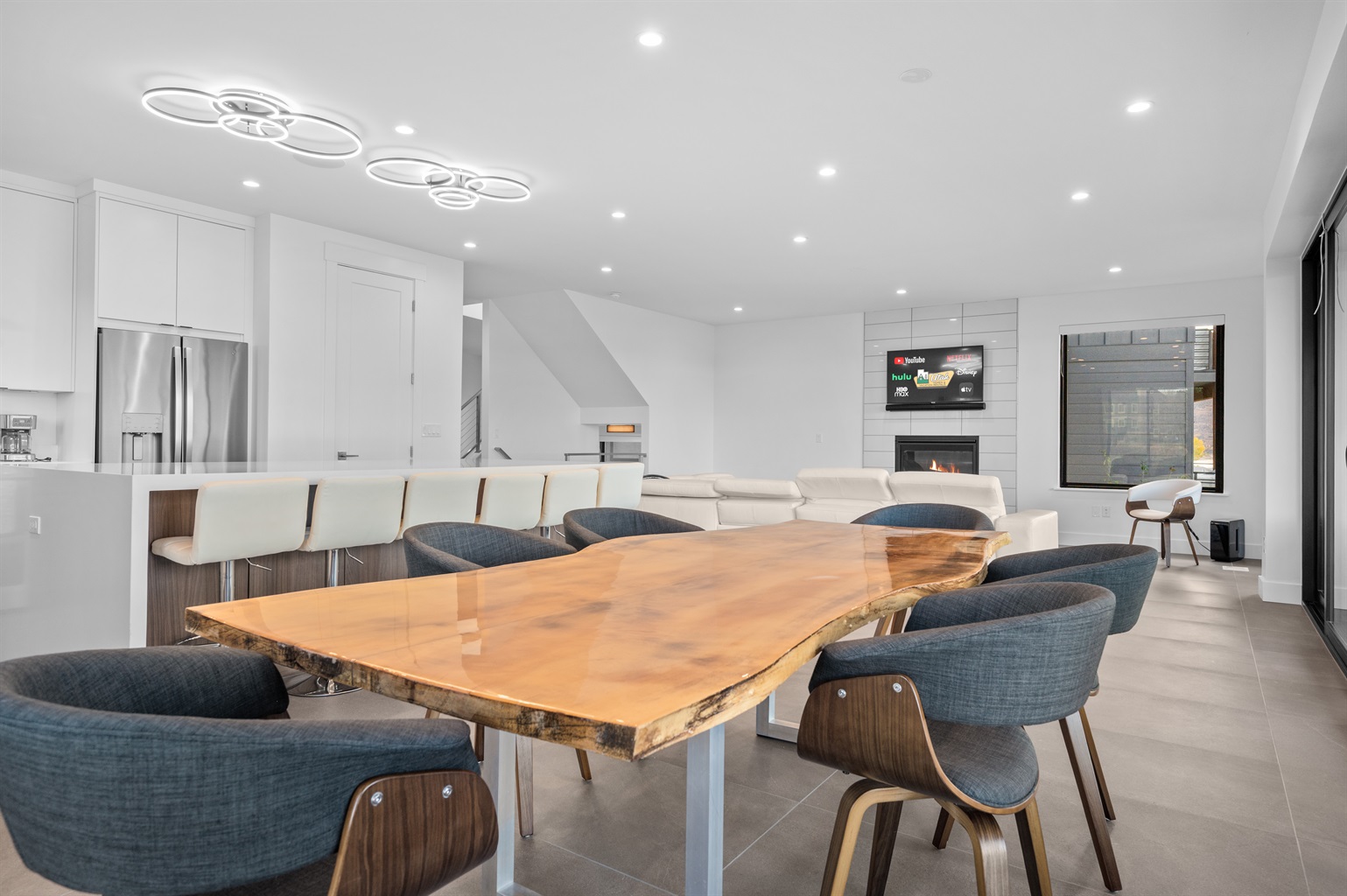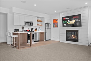 From the moment you step inside, you’re surrounded by stunning lake and mountain views through floor-to-ceiling windows. The main living area blends contemporary design with warmth, featuring a cozy fireplace, Smart TV, and an open layout ideal for relaxing after a day on the slopes. The chef’s kitchen invites gathering and connection, with a large quartz island, premium appliances, and a beautiful dining table that’s perfect for sharing stories over dinner.