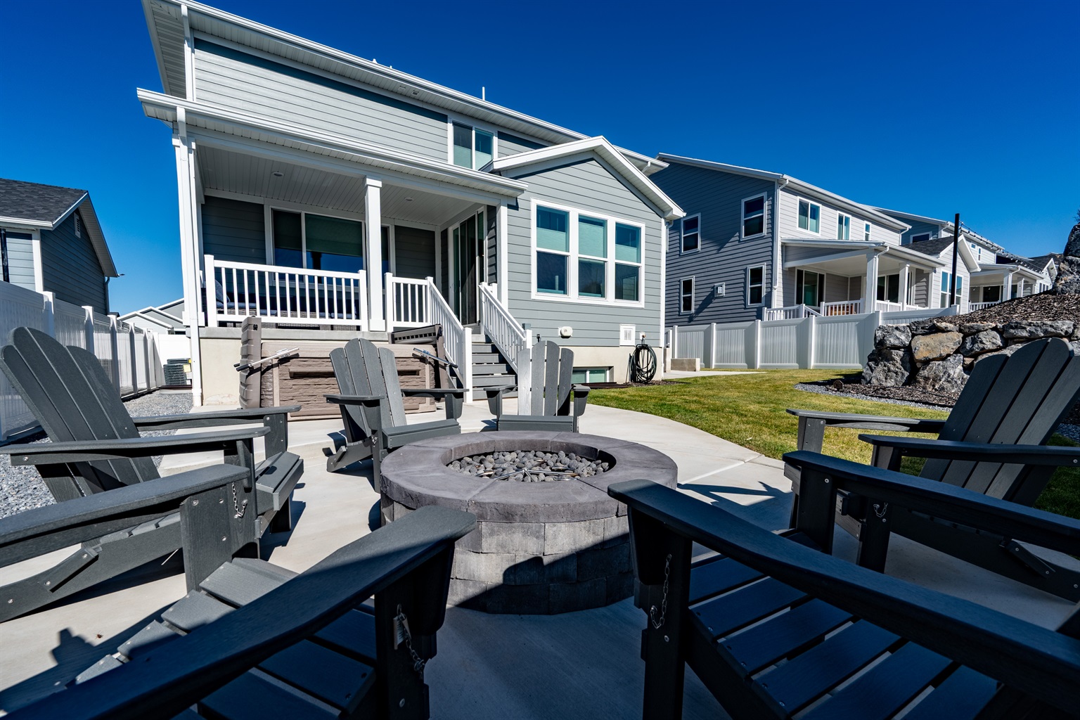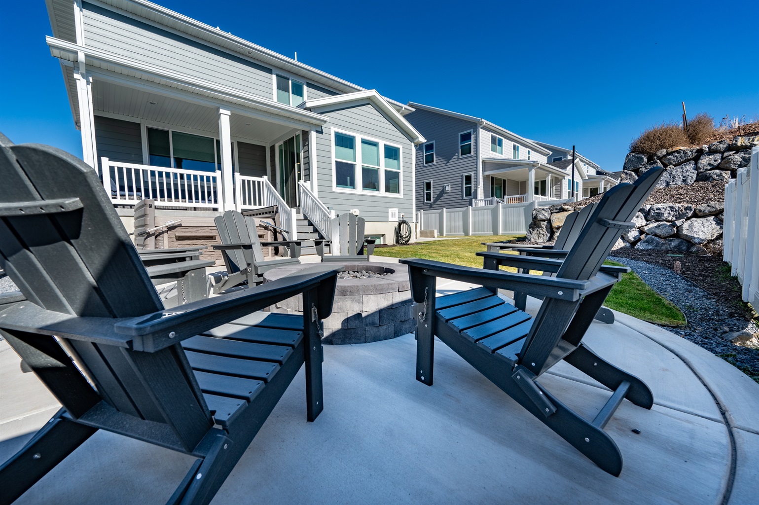 Adjacent to the kitchen, the dining area features a large table that seats eight. A sliding glass door leads to the deck and spacious backyard patio, where guests can enjoy the mountain air. Beach towels are provided in a nearby basket, and the outdoor space includes a gas BBQ grill, and a fire pit with six chairs.