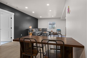 The kitchen is fully equipped for everything from casual meals to holiday feasts. It features brand-new appliances, including a gas stove, oven, microwave, dishwasher, and refrigerator with an ice maker. A large island with seating for six makes it easy to entertain, and the cabinets are stocked with all the essentials—dinnerware, wine glasses, serving bowls, cooking tools, spices, a Keurig, 12-cup coffee maker, toaster, air fryer, crockpot, blender, rice cooker, hand mixer, and more. Just off the kitchen is a mudroom near the garage entrance, where you’ll find a Pack ’n Play and highchair for families traveling with young children.
