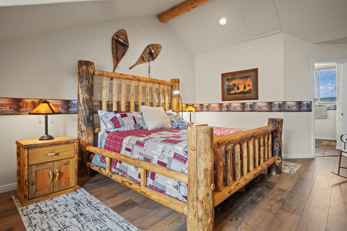 The cozy living area invites you to relax with rustic furnishings, a warm gas fireplace, large Smart TV, and scenic views through patio doors that lead to the upper deck.