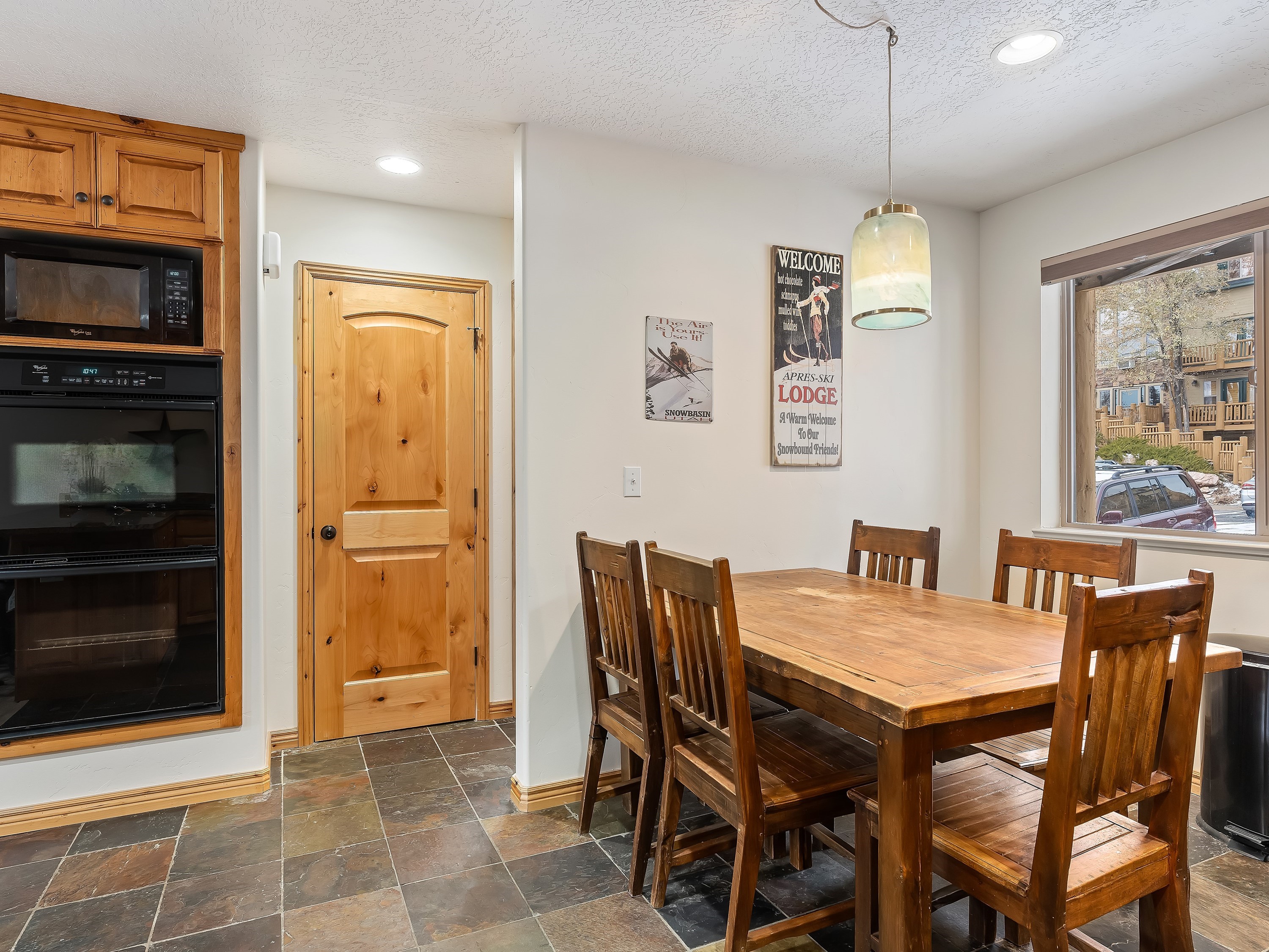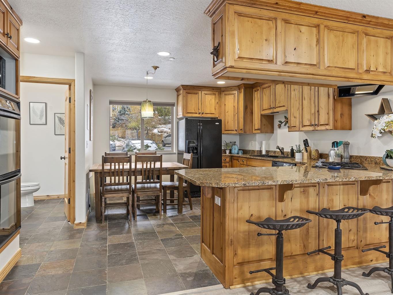 The fully equipped kitchen is a dream for home chefs, with a gas stove, double oven, microwave, large fridge with icemaker, dishwasher, and ample granite counter space. Whether you're preparing a gourmet dinner or a quick breakfast, everything you need is at your fingertips. Seating includes four stools at the kitchen bar and a dining table that comfortably seats five.