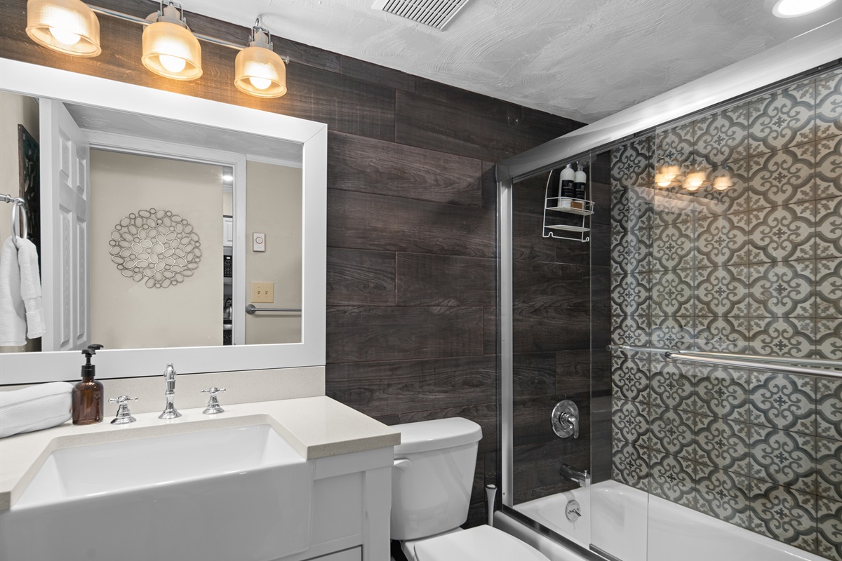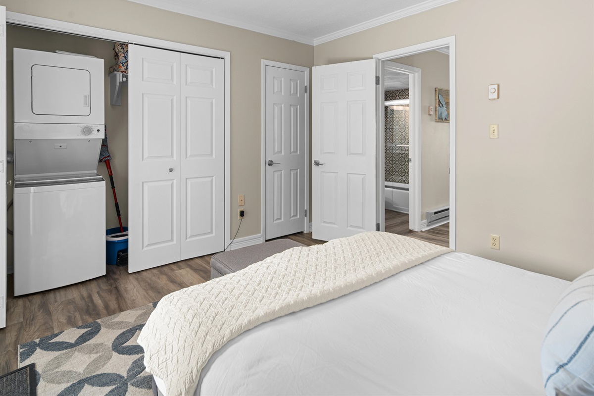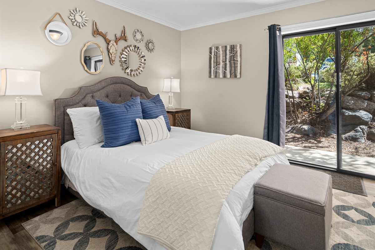 • The primary bedroom offers a cozy Queen bed, patio access, and even an in-unit washer/dryer for easy clean-up after outdoor fun.