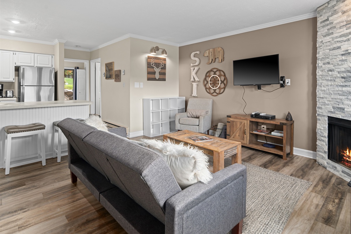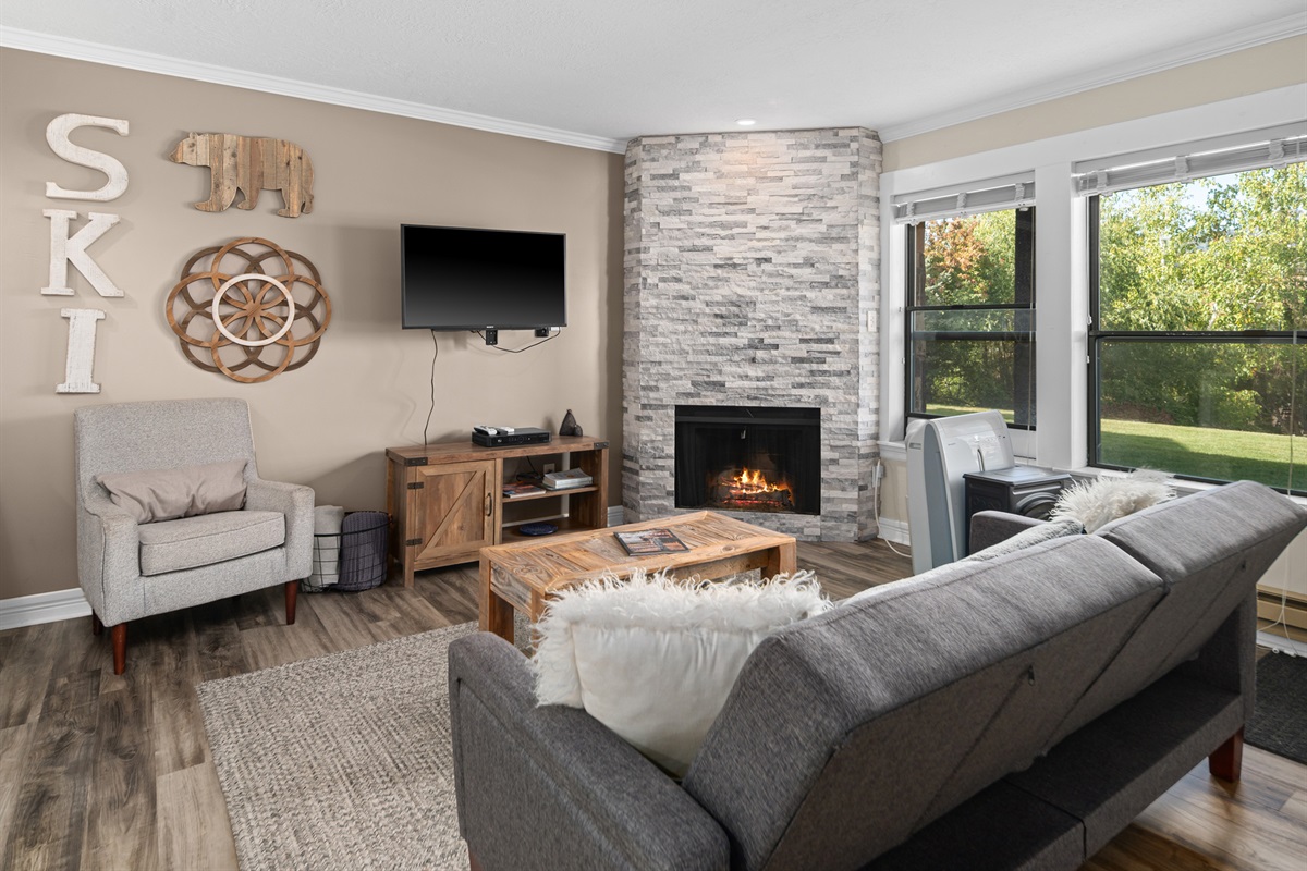 Step inside and you’re welcomed into a warm, inviting mountain retreat where comfort meets convenience. The open living space is designed for relaxing after a day of adventure, with cozy seating, soft textures, and a charming fireplace that creates the perfect après-ski atmosphere. Large windows bring in natural light, giving the space a bright yet cozy alpine feel.
