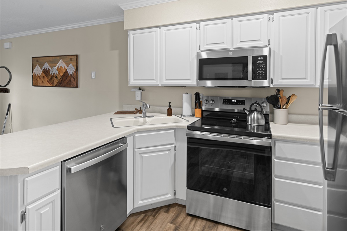 • Get comfy in the inviting living area with a flat-screen TV and a fully stocked kitchen outfitted with stainless steel appliances, cookware, and dishes.