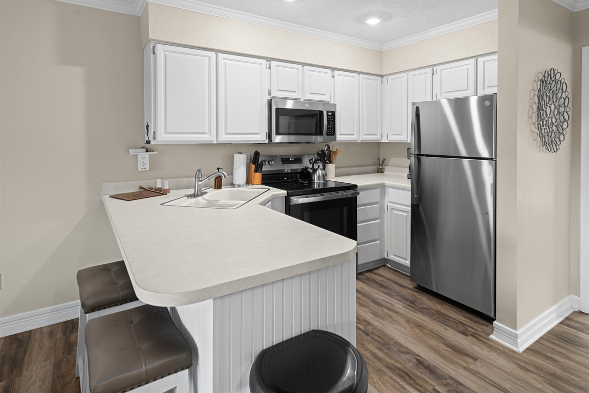 The living area flows seamlessly into the kitchen, where crisp white cabinetry, stainless steel appliances, and ample counter space make it easy to prepare meals and gather together. The breakfast bar is perfect for morning coffee or casual dining, keeping everyone connected.